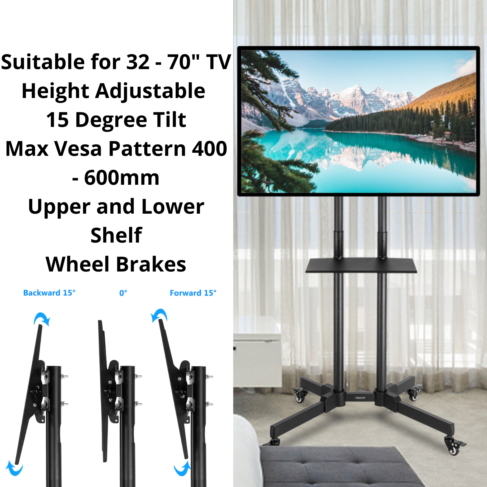 【UNIVERSAL ROLLING TV STAND】This mobile TV stand fits most 32''-70'' flat & curved TV screens, hold up to 50kg. Applicable hole distance within 60x40cm . Please confirm the weight, and size specification of your TV before purchasing.